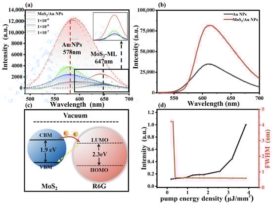 (a) PL spectra of MoS2/Au NPs without and with R6G at different concentrations. Inset: the fitted PL spectra of MoS2 without and with R6G at different concentrations. (b) PL spectra of R6G on Au NP and MoS2/Au NP substrates. (c) The band alignment (energy level alignment) between R6G and MoS2, where charge transfer is highlighted in the red path. (d) The normalized maximum emission intensity and FWHM of the MoS2/Au NPs emission peak as a function of pump energy when charge transfer is considered.