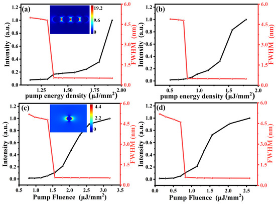 It is worth noting that the threshold of the random laser we calculated theoretically is lower than the experimental results because we set the gap between the Au NPs to 5 nm during the above-mentioned theoretical calculation, which results in a strong electric field enhancement between the Au NPs. As shown in Figure 7a, when the gap is increased to 10 nm, the enhancement of the electric field of Au NPs decreases to 19.2, and the threshold of the random laser increases to 1.369 µJ/mm2. The random laser action of Au NPs coated with MoS2 is shown in Figure 7b, and its threshold is 0.719 µJ/mm2, which also reduces by 47.4%. We also calculated the lasing behavior of a single Au NP, as shown in Figure 7c,d. The enhancement of the electric field decreases to 4.4, and the threshold of the random laser increases to 1.561 µJ/mm2. When Au NPs are coated with MoS2, the threshold is reduced to 0.828 µJ/mm2, which also reduces by 46.9%, which is still consistent with the experimental results. The enhancement of the electric field affects only the threshold of the nanolaser but does not affect the effect of charge transfer on the threshold.