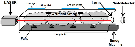 A block diagram of the experimental setup for the FSO link through artificially generated smog is shown in Figure 1. The laboratory setup consists of a laser, photo-diode, smog machine, and custom-designed 6 m sealed acrylic chamber with precise control mechanisms for introducing smog constituents. Fans are used to achieve homogeneity of the artificially generated smog throughout the chamber. A mixture of nitrogen oxides and volatile organic compounds is injected into the chamber using a smog machine to emulate smog conditions. UV lights are used for a limited time to produce small amounts of secondary pollutants, like formaldehyde. All precautionary measurements are considered while conducting the experiments. The aerosols are slowly moving fine particles suspended inside the chamber. It is observed that increasing the observation length can reduce the effect of any non-homogeneous smog patches inside the chamber. A small change in the density of aerosols can cause a significant change in the value of as given by Equation (6). Two different approaches are used to characterize the smog attenuation, (i) based on different levels of visibility and (ii) different values of operating wavelengths, i.e., 780 nm and 1550 nm. At T = 0, we measure the link attenuation before the smog injection and mark its value as a reference for further reading. Artificial smog is then injected inside the chamber through a vent hole and allowed a time of 5 min to spread homogeneously before acquiring data points again. The smog density is controlled using air outlets to create dense to very light smog inside the chamber. The received optical power is measured using THORLABS PM320E (Thorlabs Inc., Newton, NJ, USA) constantly until the chamber is free from smog. The geometric and reflection losses from the walls of the chamber are not considered as the received power is measured for both with and without smog. The normalized transmittance T is determined by the ratio of the received power without smog to the received power with smog. This experimental procedure is followed to acquire datasets for both 780 nm and 1550 nm using THORLABS CLD-1015 (Thorlabs Inc., Newton, NJ, USA) and Santec WSL-100 lasers (Santec, Komaki-City, Japan), respectively. Figure 2 shows the experimental setup to measure the smog attenuation.