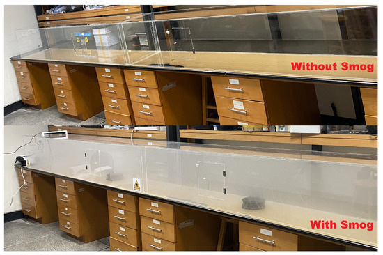 Before conducting the experiments, the optical components are carefully calibrated to ensure accurate and reliable measurements. This includes aligning the laser beam path and optimizing the receiver sensitivity. Calibration procedures are performed iteratively to account for any drift or variations in the system parameters. The data collection involves systematically varying the density of the artificial smog within the chamber and recording the corresponding optical signal power levels at the receiver. The visibility increases with time as the smog in the chamber settles. The visibility inside the chamber can be measured using any of the two methods discussed in [24]. We use a broad-spectrum halogen light to measure the transmittance over the length of the chamber and then calculate the visibility index using . Standard visibility levels for different weather conditions can be found in [25]. Measurements are taken at regular intervals (after every 0.1 s) to ensure a comprehensive dataset. Additionally, control experiments are conducted without the presence of smog to establish a baseline reference. The experiment is repeated three times with the same controlled atmospheric conditions, and then the average of the datasets is used to analyze the system. Figure 3 shows the chamber with and without smog. The data points are categorized based on the smog density levels for the subsequent analysis. Table 1 shows the considered characteristics of the FSO system.