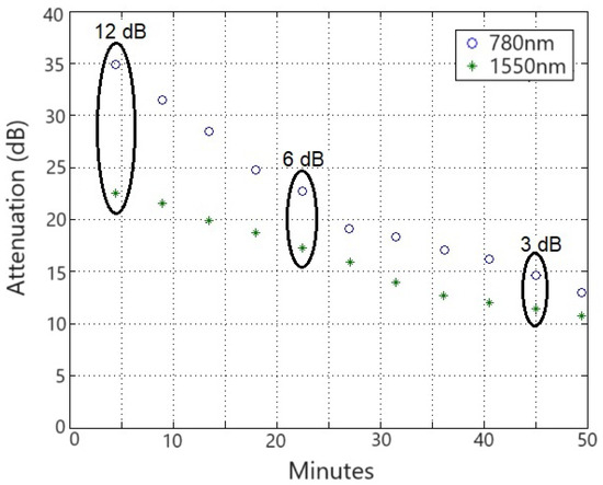 Figure 4 shows the measured smog attenuation (dB) against the observation time (approx. 50 min) for 780 nm and 1550 nm. Comparing the settling time of the smog with fog, it is observed that smog particles take more time to settle as compared to the fog [26,27]. This is because smog contains high concentrations of particles, which are lighter as compared to water droplets in fog. The measured attenuation is higher at 780 nm than at 1550 nm for the given period. The result demonstrates a clear correlation between the wavelength and the extent of the signal degradation. We can also quantitatively describe the relationship between the smog density and optical signal attenuation. As the smog density decreases with time, a proportional decrease in the signal attenuation can be observed. There is an attenuation difference of 12 dB, 8 dB, and 3 dB for the two lasers at dense, moderate, and light smog, respectively, inside the chamber of a length of 6 m.