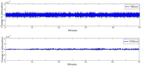 Figure 5 shows the change in the specific attenuation for both wavelengths. It can be observed that the 1550 nm channel is more stable as compared to the 780 nm channel and has low magnitudes of a specific change in attenuation. There can be two reasons behind this behavior. (i) The 780 nm laser used has low power stability as compared to the 1550 nm laser as shown in Table 1. These fluctuations in the transmitted power can induce a profound effect on attenuation. (ii) The wavelength 780 nm is more vulnerable to smog channels and establishes an unstable optical link as compared to 1550 nm.