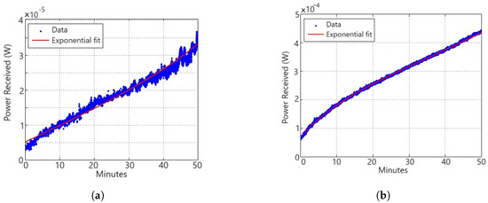 Power received and its co-relation with exponential curve fitting for (a) 780 nm and (b) 1550 nm.