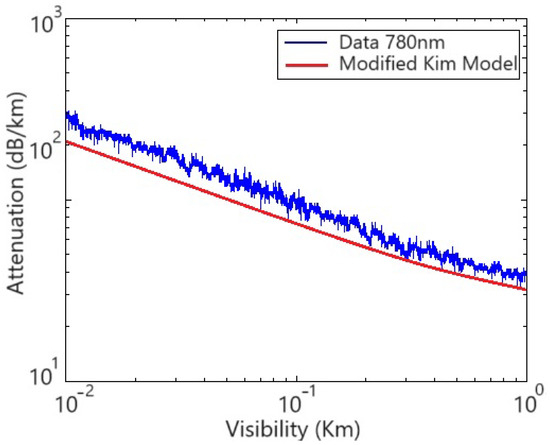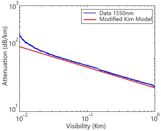 Figure 7 and Figure 8 show a log–log plot for the smog attenuation against the visibility for the 780 nm and 1550 nm wavelengths. The log–log plot of the attenuation curve obtained from the measured dataset shows good coherence with the proposed modified model defined by Equation (6). This indicates the wavelength dependency of smog attenuation as predicted by the modified Kim model. The plot also shows that the smog attenuation for the 780 nm wavelength is almost 125 dB/km, 105 dB/km, and 45 dB/km for dense, moderate, and light smog, respectively. The smog attenuation for the 1550 nm wavelength is almost 112 dB/km, 70 dB/km, and 35 dB/km for dense, moderate, and light smog, respectively. These measurements were carefully taken under artificial smog conditions wherein the visibility decreases linearly with time and is quite homogeneous in nature. Whereas, for outdoor measurements, the attenuation values can reach up to 120 dB/km for continental fog and up to 480 dB/km for maritime fog [28]. This is because of the fact that naturally occurring fog is not homogeneous and has different particle density patches throughout the length. The temperature, humidity, and wind vary randomly in outdoor environments and can cause significant attenuation.