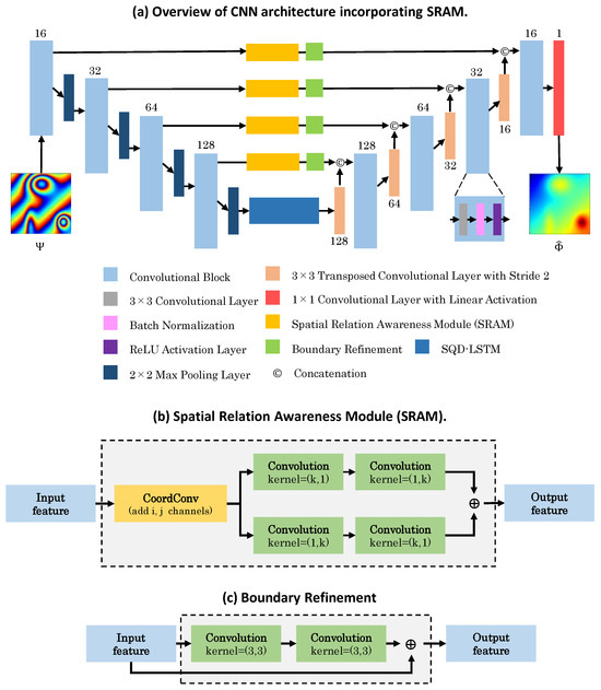 In this study, we propose a new module called the spatial relation awareness module (SRAM) that combines a global convolution network (GCN) [25], which applies a convolution layer with a kernel size equivalent to that of the feature maps, and CoordConv [26], which strengthens the consideration of the positional relationships between pixels. Figure 1 illustrates the integration of SRAM and the CNN-based architecture utilized in this study. SRAM is specifically applied to the skip connection of the encoder–decoder model, imparting global features to the decoder that considers the pixel positional relationships crucial for effective phase unwrapping.