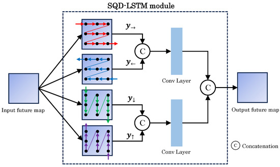 Furthermore, in [8], a CNN incorporating SQD-LSTM module was introduced as a remedy for phase unwrapping, addressing the challenges through regression tasks. It has been reported that incorporating SQD-LSTM into the bottleneck of the encoder–decoder model improves the performance of phase unwrapping. The architecture of the SQD-LSTM is illustrated in Figure 3. The SQD-LSTM module employs four distinct LSTMs [29] to extract spatial relationships in four directions (specifically, left-to-right, right-to-left, top-to-bottom, and bottom-to-top) from the encoded features. The four features obtained from each direction are represented as , , , and , respectively. The SQD-LSTM facilitates the recovery of a continuous true phase by learning the spatial relationships of features.