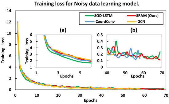 Graphs of training loss for each model trained on the noisy dataset. The inset graph (a) has been enlarged to the range of epoch from 0 to 10, and training loss up to 6, the inset (b) has been enlarged to the range of epoch from 40 to 70 and training loss up to 0.5, allowing for a detailed examination of the data.