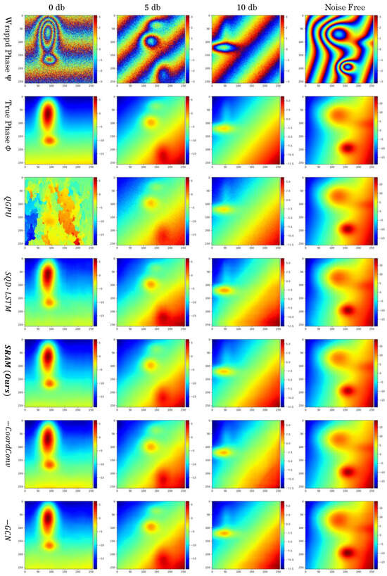 QGPU exhibited significantly lower performance when dealing with data with strong noise levels of 0 and 5 dB. Compared with other methods, including ablation models, the proposed method achieves high-precision phase unwrapping across a wide range of noise levels, demonstrating its high robustness against noise.