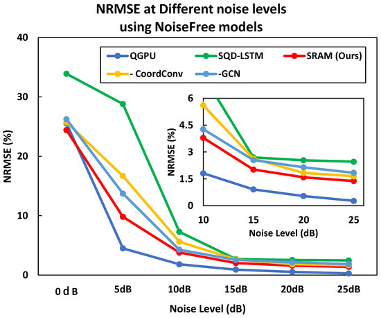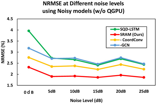 NRMSE at different noise levels using Noisy models (w/o QGPU). The results of QGPU are not depicted in the graph because the range of RMSE values differs from other methods, but detailed information is provided in Table 3.