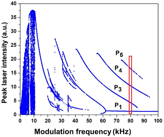 These equations can be solved numerically by modulating the pump current of the laser diode with a periodic signal and analyzing the response of the laser to changes in modulation frequency and amplitude. Figure 2 shows the bifurcation diagram of the local maxima of the laser intensity obtained by varying modulation frequency for fixed modulation depth . The frequency was changed in steps of 1 kHz, and a random initial condition was used for each change. The region of multistability explored in this paper are marked in red. One can see that at kHz, the laser exhibits the coexistence of four stable periodic orbits (P1, P3, P4, P5).