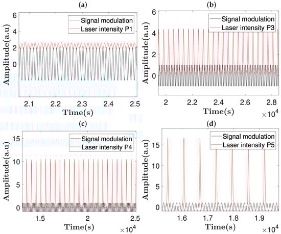 Time series of the laser intensity corresponding to (a) P1, (b) P3, (c) P4, and (d) P5 coexisting periodic orbits for modulation depth and frequency kHz.