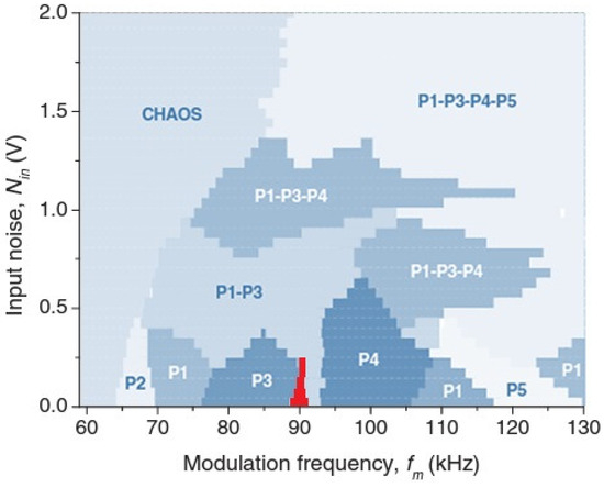 The diagram in Figure 4 displays the regions of various intermittency regimes experimentally observed in the EDFL in the parameter space of the modulation frequency and input noise intensity [27]. One can note the appearance of new intermittency attractors as the input noise intensity is increased. These attractors represent the mixture of P1 and P3 states; P1, P3, P4; and P1, P3, P4, P5; each state has different frequency, as indicated in Remark 1.