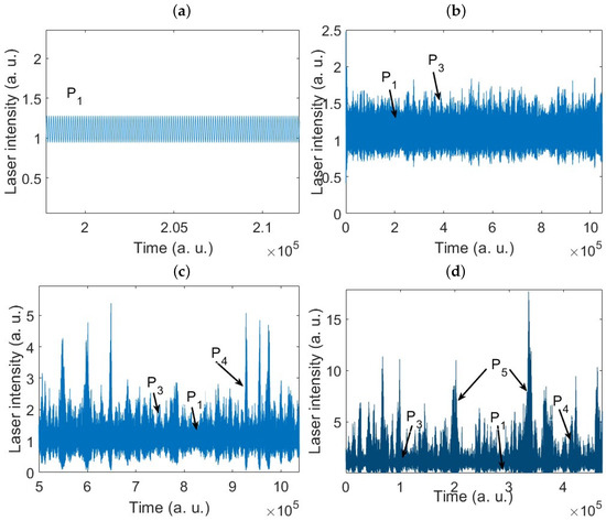 While without noise () the laser stays in one of the coexisting attractors depending on the initial conditions, say P1 (Figure 5a), increasing noise intensity induces first into two-state intermittency (switches between P1 and P3), then tri-state intermittency (switches between P1, P3, and P4), and finally multistate intermittency (switches between P1, P3, P4, and P5 [27]. To facilitate the identification of distinct periodic states in the intermittent dynamics shown in Figure 5, Table 2 provides information about noise intensity for each intermittent state.