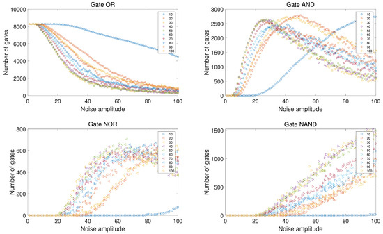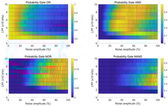 Figure 6 illustrates the assessment of each coexistent state in the EDFL for varying the noise intensity on the abscissa and LPF value on the ordinate. As outlined in Remark 3, the graphs in Figure 6 hold different logic gates. Notably, when the applied filter value is below 20 kHz, the observed behavior exhibits minimal variation compared to the system without LPF, consistent with previous observations [2].