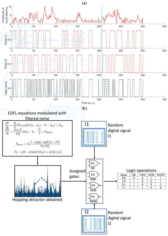 (a) Logic operations are defined by the local maxima of time series (upper trace) defining a logic gate. The squared red time series (middle traces) are two logic random signals and the black squared signal (lower trace) results from the operation defined by the laser-filtered noisy signal. (b) Schematic representation of the EDFL application for logic gate operations.