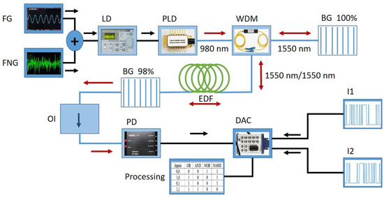 The proposed method can be implemented through the experimental setup illustrated in Figure 10. A conceivable configuration incorporates key elements such as a function generator (FG) and a function noisy generator (FNG) facilitating modulation in a laser driver (LD). In the diagram, the erbium-doped fiber laser (EDFL) is delineated by black lines. An optical isolator (OI) is employed to prevent the ingress of reflected light, preserving the laser’s dynamical behavior. Subsequent to traversing the OI, the laser light impinges on a photo detector (PD), converting it into an electrical signal received by a data acquisition card (DAC).