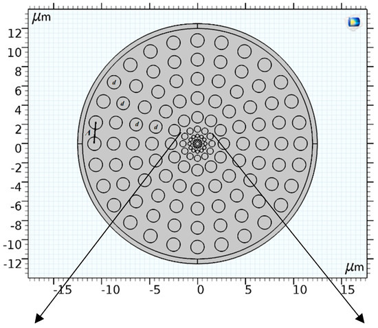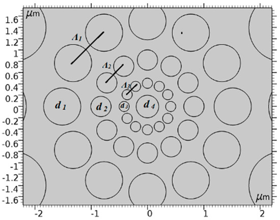 Figure 1 shows a cross-sectional image of the proposed structure. The geometry of the designed PCF structure consists of five layers of circular holes in the cladding region, the diameter of which is defined by the d parameter. The core region consists of three circular layers surrounding the bigger central hole. The diameters of core holes from the outside to the inside are d1, d2, d3, and d4. The distance between one hole and the next hole is called the pitch and is denoted by Λ. The refractive index of air is 1, and the refractive index of silica, which is located in the background area of the fiber, is 1.45. The Perfectly Matched Layer (PML) has been used as a boundary condition to eliminate electromagnetic noise. The size of PML is 10% of the size of the whole PCF. It is clear that the performance of the PCF is directly influenced by the geometric dimensions and how the holes are arranged in the core and cladding areas. The parameters of the core region have a significant effect on the relative sensitivity. The changes in the holes in the cladding area have the greatest impact on the confinement losses. In order to obtain the desired structure, parametric studies and numerous simulations have been performed. After reviewing and summarizing the results, the parameters presented in Table 1 have been selected as the final geometry. As is clear from Table 1, the holes in the core area gradually get bigger. As a result, the amount of optical power in the center of the PCF increases, and the interaction of light with the sample gas increases. Eventually, the relative sensitivity increases. The holes in the cladding area are larger than the holes in the core area, which reduces confinement loss.