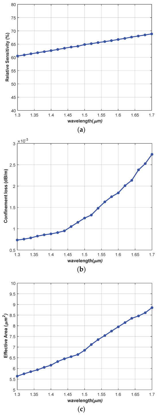 Effect of wavelength on (a) relative sensitivity, (b) confinement loss, and (c) effective area.