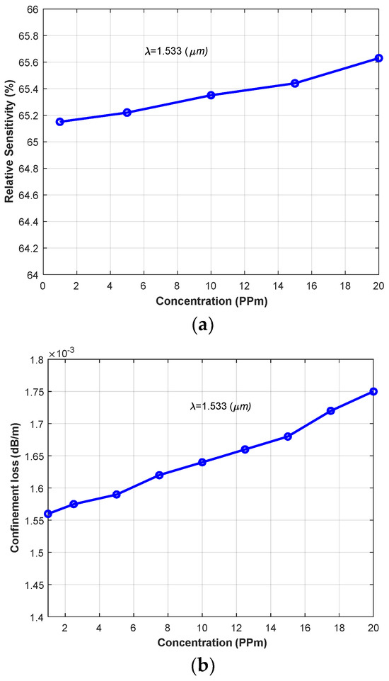 Figure 5a,b show the effect of the hydrogen cyanide gas concentration on the relative sensitivity and confinement loss for concentrations from 0 ppm to 20 ppm at the wavelength of 1.553 µm. The theoretical basis for relating refractive index to density is embedded in the state equation of electromagnetic polarization. As the electromagnetic wave travels through a medium, the wave’s phase velocity changes proportionally to the refractive index of the substance. The end result is the so-called Lorentz–Lorenz equation relating the refractive index to molecular molar density. The Lorentz–Lorenz equation applies to an isotropic system containing nonpolar substances with no molecular interactions [29]. To model the density effect on the HCN gas, the heat transfer module has been added to the physics of the problem. The refractive index of different gas concentrations is estimated. The pressure and temperature are assumed to be 1 atm and 25 °C, respectively. As can be seen, by increasing the concentration of this gas, the relative sensitivity is also enhanced. Figure 5b also shows that as the concentration of this gas increases, confinement losses will also increase. The relative sensitivities for concentrations of 1 ppm, 5 ppm, 10 ppm, 15 ppm, and 20 ppm are equal to 65.17%, 65.22%, 65.38%, 65.42%, and 65.61%.