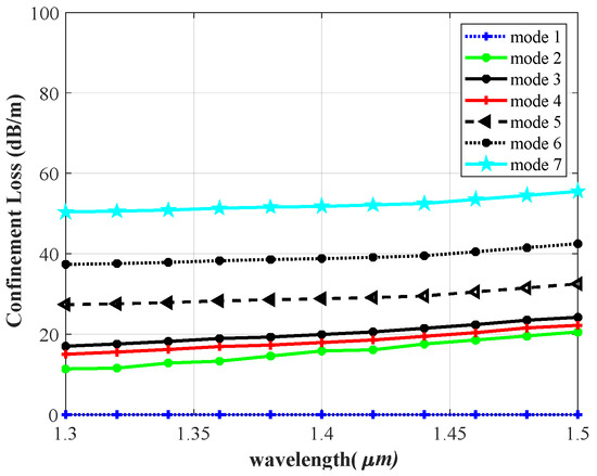 The designed structure has seven modes according to Figure 6. The only guided mode is the fundamental mode (mode 1), and the other modes are radiation. It is clear that, only in the fundamental mode, the light is trapped in the core region owing to the low confinement loss. Meanwhile, other modes are evanescent and cladding scattering. So, higher-order modes do not affect the sensing mechanism.
