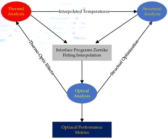 To date, this method has been applied to the design of optical instruments such as space optical instruments and large ground-based telescopes, and it is used to evaluate whether the optical performance of optical systems fulfills the requirements under the action of mechanical/thermal environmental loads [15,16,17,18,19,20]. The characteristics of the thermal–optical–mechanical elements in the Subarcsecond Telescope and BaLloon Experiment (STABLE) directly affect the quality of the point-spread function of the guide star on the detector, so a series of thermal, structural, and optical models were built to simulate system performance and ultimately inform the final pointing stability predictions [15]. During the development process of projects such as the Laser Interferometer Space Antenna (LISA) [16], Wide-Field Infrared Survey Telescope (WFIRST) [17], Narrow-Field Infrared Adaptive Optics System (NFIRAOS) [18], 4 m telescope for habitable exoplanet observation mission (HabEx) [19], and Advanced Terrain Laser Altimeter System (ATLAS) [20] in the ICESat-2 mission, an optical mechanical thermal integration analysis model was established, and the analysis results were validated for the system design.