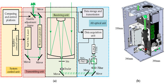 LiDAR system structure design involves the comprehensive application of various aspects, including optical, mechanical, electrical, thermal, and software design. The continuous development of laser and detection technologies, particularly the ongoing maturation of miniature laser technology, has enabled the effective control of LiDAR integrated systems in terms of size and cost [1,2]. Typical varieties of micro-pulse LiDAR (MPL), characterized by a high repetition rate and low energy, have been widely studied and applied. The Global Micro-Pulse LiDAR Network (MPLNET), established by the National Aeronautics and Space Organization of the United States, is used for full-time, fully automatic observation of aerosols and clouds worldwide [3,4]. The MiniMPL, produced by Sigma Space, has a detection range of about 10 km during the day; at night, the detection distance is about 20 km [5]. The Cloud Aerosol Transport System (CATS) [6,7] was developed by NASA in the United States and has an orbital altitude of 405 km. Two launch systems were designed to achieve different detection modes. One of the lasers was inherited and developed from Cloud Physics LiDAR (CPL) [8], with a repetition rate of 5 kHz and an energy of 2 mJ; the other laser features a seed injection pulse laser, which was inherited and developed with the airborne cloud–aerosol transmission system [9], with a repetition frequency of 4 kHz and an energy of 2 mJ. MPL has been developed by relevant scientific research institutions in China for vertical, horizontal, and three-dimensional scanning detection of atmospheric aerosols and clouds. According to the detection results, the detection distance is 3–5 km during the day, and it is 10–15 km at night [10,11,12].
