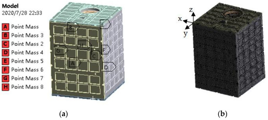 To effectively construct the finite element model of the integrated system, the system structure must be simplified, as shown in Figure 3a. In the simplified structure, the laser is mass point A, with a mass of 5 kg acting on the fixed aperture, the motorized adjusting structure and its fixed lens denote mass point B, with a mass of 0.201 kg acting on the fixed aperture, the beam expanding system is mass point C, with a mass of 0.500 kg acting on the fixed aperture, the polarizing prism and detector represent mass point D, with a mass of 0.200 kg acting on the fixed prism structure, the industrial personal computer and its fixed structural parts are mass point E with a mass of 0.200 kg acting on the fixed aperture, the acquisition card and its fixed structural parts are mass point F with a mass of 0.200 kg acting on the fixed aperture, the electronic control unit is mass point G, with a mass of 5 kg acting on the fixed plate surface, and the high-precision three-dimensional adjusting structure is mass point H, with a mass of 0.500 kg acting on the fixed aperture.