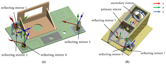 Establishment of local coordinate systems for each mirror of the transmitting unit: (a) transmitting unit; (b) receiving and aft optical units.