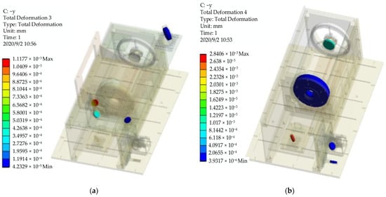 The Y direction of the gravity load is the placement direction for the installation and testing of the LiDAR system; therefore, the analysis was performed with the Y direction of the gravity load to obtain the deformation of the integrated system under the effect of gravity. Further, the effect of the deformation of each optical element on the optical performance of the integrated system was determined via optical–mechanical integration analysis.