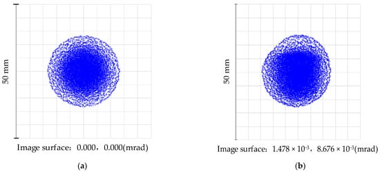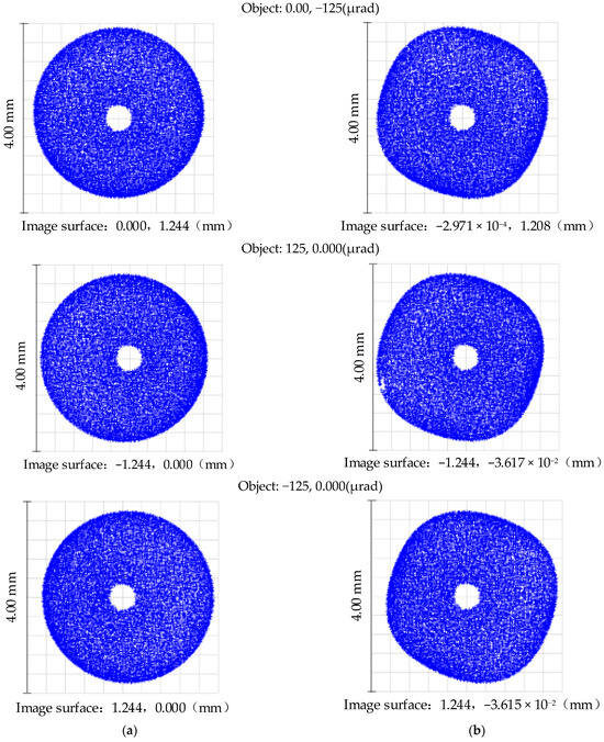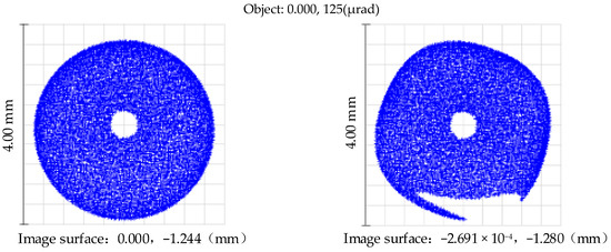 In summary, with the simulated 125 μrad (half angle) field of view at different incidence angles, the eccentricity and radius of the dispersion spots are changed to different degrees, which is due to the relative displacement of the telescope’s primary- and secondary-mirror optical surfaces and their surface deflections under the effect of gravity, resulting in a receiving field of view smaller than 250 μrad with a 0.4 mm iris. Simulation suggested that the focal length of the telescope increased by 89 μm, and the field of view of the telescope was 244 μrad, which was 2.4% less than 250 μrad.