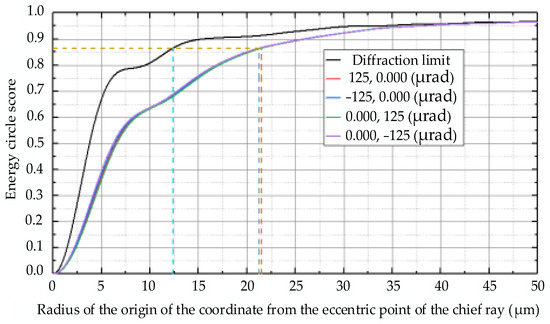 As shown in Figure 8, the radius of the dispersion spot at the diffraction limit is 12.361 μm when the encircled energy fraction is 86.5%. The maximum radius of the dispersion spot was 21.501 μm, and the diameter of the iris required was calculated to be 407.202 μm.