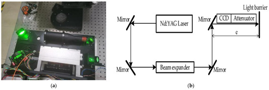 To detect the divergence angle of the laser, the detection optical path was designed as shown in Figure 9b. The spot on the light barrier was detected using a charge-coupled device (CCD) camera, and the diameter of the spot with an encircled energy of 86.5% was selected. At e = 0.5 m, the detected average value of the spot diameter was 21.050 mm. At e = 20 m, the detected average value of the spot diameter was 21.270 mm, and the calculated divergence angle of the laser was 113 μrad, showing a relative error of 2.586% compared to the simulated value of 116 μrad under a gravity load, which was mainly determined using the actual divergence angle of the laser and the performance of the beam expander.