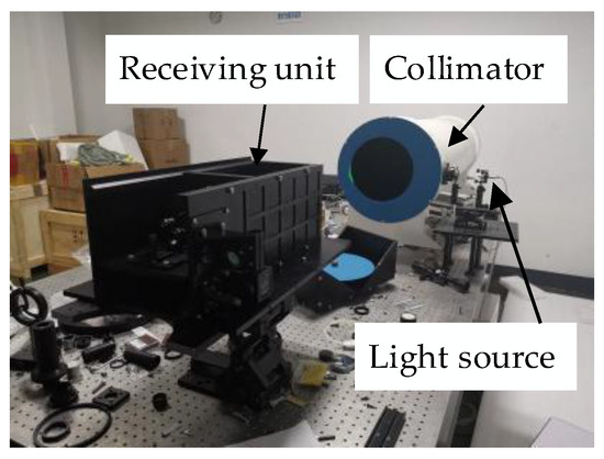 The optical–mechanical structure of the transmission unit was installed and tested. Figure 9a shows the actual picture of the installation and test experiment of the transmission unit. In the experiment, the laser and adjusted beam expander were first fixed on the working plate. The direction of the laser beam from the laser was adjusted by the beam-steering structure and highly collimated into the beam expander, and then it was reflected out by the two mirrors.