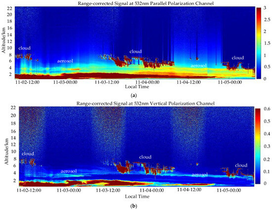 Distance-corrected signals for (a) Parallel and (b) Vertical Palarization channels during the continuous detection period from 2 November 2020 to 5 November 2020.