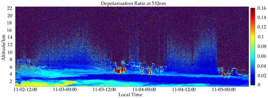 Continuous detection experiments of clouds and aerosols in the atmosphere over Hefei were conducted using the system from 09:00 a.m. on 2 November 2020 to 07:38 a.m. on 5 November 2020. The distance-corrected signals for the Parallel and Vertical polarization channels during the detection period are shown in Figure 11, with larger values representing higher aerosol content. The time evolution of the inverted depolarization ratio profiles of clouds and aerosols during the detection period is shown in Figure 12.