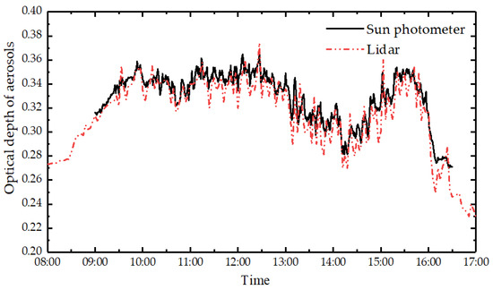 LiDAR was used to calculate the optical depth of aerosols, and to validate the calculation results, a comparative experiment was conducted with a sun photometer. Because the sun photometer is not accurate in the presence of clouds and can only be used for detection during daytime, the comparative experiment was conducted on 7 November 2020, when the sky was clear and cloudless. The corresponding results are shown in Figure 13.