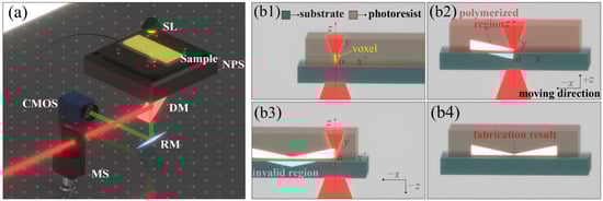 The MNDNS fabrication process is illustrated in Figure 1(b1–b4). As shown in Figure 1(b1), at the beginning of the fabrication process, the TPP-LDW focus is located near the interface between the photoresist and the substrate, and the voxel size depends on the laser exposure time. Subsequently, the laser focus remains still, and the NPS platform starts to move along the negative x-axis and the positive z-axis directions simultaneously. As shown in Figure 1(b2), due to the two-photon polymerization effect, a polymerization region forms along the path of the voxel. As the NPS rises in the z-direction, the laser-processed voxel gradually sinks into the substrate, reducing the polymerization region and forming a smoothly transitioning needle structure. When the voxel is about to completely sink into the substrate, the NPS movement along the z-axis changes to the negative direction; then, the laser focus gradually rises from the substrate to fabricate a symmetric dual needle structure. Finally, the shutter is closed to complete the fabrication of MNDNS, and the fabricated structure is shown in Figure 1(b4).