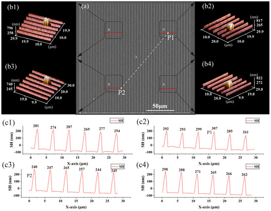 To quantitatively understand the compensation accuracy of the FIAFPC, periodic linear structural processing is performed within the total working range of the NPS (200 μm × 200 μm). The interval of the structures is 5 μm, the laser power at the pupil is 8.04 mW, and the processing speed is 20 μm/s. After proactive compensation based on FIAFPC and determining the interface between the focus and the photoresist base, the NPS is moved downward by 0.3 μm as the starting position for processing. A Chinese character “正” is fabricated as a mark at specific locations, it serves as a square character for relative standards and is commonly used as a position marker for processing. Here, four square marks with a side length of 3 μm are manufactured at the four corners of the processing area, 50 μm away from the edges. The processing results are shown in Figure 4. Figure 4a is the overall SEM image of the linear structural array. It can be observed that the overall integrity of the line structure remains intact without any defocusing or misalignment. To determine the height variation information of the structure, AFM scans were performed at the position of the mark, obtaining three-dimensional morphological profiles at these specific locations Figure 4(b1–b4). From the height slice information, the maximum height is 307 nm, the minimum height is 240 nm, and the average height is nm. The standard deviation can be expressed as . According to the structural profile from Figure 4(c1–c4), it is seen that the entire height of the structures in Figure 4(c2) is the highest, while the entire height of the structures in Figure 4(c3) is the lowest in the four AFM measuring areas. In other words, there is a slight angle between the processing plane and the objective plane with the FIAFPC. By dividing the height difference between the highest point P1 and the lowest point P2 in Figure 4(c2,c3), respectively, by the distance between them, the angle is approximately 4.65 × 10−4 rad, one order of magnitude less than the angle that may influence the fabrication process. The uncertainty primarily comes from two aspects: one is epistemic uncertainty in the relative height of the fluorescence imaging analysis substrate, and the other is aleatory uncertainty introduced by the movement of the NPS itself.