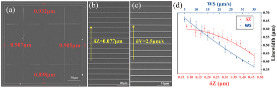 Figure 5d shows the linewidth measured using the particle size analysis software Nano Measurer. As can be seen from the existing calibration, either raising the NPS or increasing the fabrication speed could reduce the linewidth. The change in linewidth when raising the z-axis height is more pronounced, which is directly related to the elliptical shape of the voxel (the linewidth decreases rapidly when the substrate is close to the top end of the elliptical voxel). The increase in speed leads to a linear change in linewidth, which means the exposure dose depends linearly on the fabrication speed.