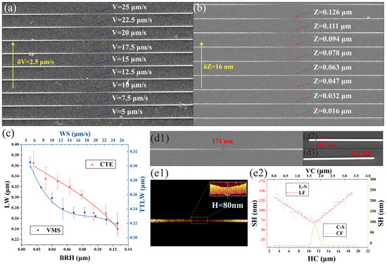 Figure 5b,c show the variations in the fabricating linewidth when the NPS height rose and the baseline speed increased, respectively. In Figure 5b, the laser pupil power is 7.78 mW, and the fabrication results are obtained by gradually raising the NPS height with a constant processing speed of 10 μm/s (the interface is located at the center of the voxel at the beginning of processing). In this case, the lifting of the NPS results in the gradual immersion of the focus into the glass substrate, so that the voxel involved in the exposure is reduced in morphology, thereby reducing the height and linewidth of the MNDNS. Meanwhile, Figure 5c represents the results obtained by changing the processing speed V without changing the height parameter and laser pupil power. Increasing the fabrication speed means reduction in the exposure, thus the linewidth of the processed structure decreases accordingly (the interface is located at the center of the voxel at the beginning of processing).
