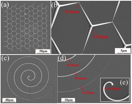 In addition, the FIAFPC method can be applied to the fabrication of more complex structures with continuously varying morphological gradients. In Figure 7a, a hexagon lattice structure was fabricated based on this method, where each hexagon is composed of three morphological gradient needle structures. In this lattice structure, the linewidth at the tip of each needle is approximately 0.260 μm, and the bottom linewidth is approximately 1.030 μm. The tips of every three micro/nanoneedles are connected to the same height feature point with the other two needles, ultimately creating a hexagon lattice structure with alternating heights. Figure 7c shows an Archimedean spiral structure with continuously graded height. Using the normal of the substrate plane as the axis of rotation and an arithmetic angle as the independent variable, the increasing radius angle of each processing point is 0.0275 rad relative to the previous point, while the radius increases two-fold over the current accumulated angle relative to the initial position, generating equidistant spiral curves. Meanwhile, the voxel evenly sinks into the substrate along the z-axis, and the overall height and linewidth of the spiral structure gradually decreases from the center of the pattern to the periphery. When processing gradient curve structures, all working axes of the NPS need to reach the target position simultaneously to ensure this in each subdivided processing step. It is necessary to recalculate the required velocities of each axis based on the compensated path. As the speeds of each axis need to dynamically change during the fabrication, the integrated program developed by this group is used to recursively calculate the speeds for each stage in advance, which are then pre-allocated in the NPS buffer to reduce the exposure offset caused by waiting during processing computation time. The focal point gradually penetrates the substrate along the spiral path relative to the substrate plane, and the fabrication linewidth also shrinks from 0.62 μm to 0.25 μm, or even narrower. The structures above can be replicated to obtain corresponding morphological gradient micro/nano channels through inverse molding, holding potential application value in micro/nano fluidics.