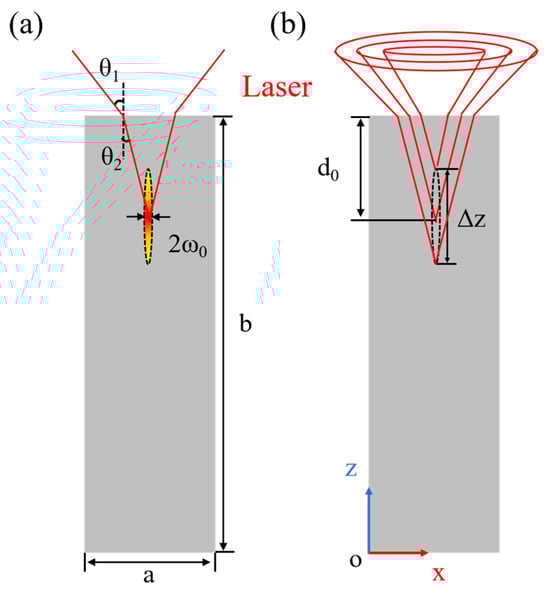 (a) A two-dimensional model diagram of the x–z plane of numerical simulation. (b) Diagram of the laser propagation inside the 4H-SiC to form a stretch focus zone.