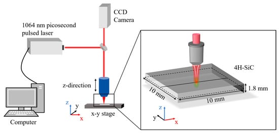 The inherent hardness and limited plasticity of SiC present challenges in achieving precision during wafer slicing through the wire saw process of diamond wire slicing [9]. Recently, many new methods offered a viable alternative, such as the synergistic processing of wet-oxidation-assisted chemical mechanical polishing and thermal annealing [10], laser modification, and so on [11]. At sufficiently high laser energy density, the tunneling ionization is initiated inside the SiC [12]. In this process, the electrons within the material undergo excitation induced by the laser, transitioning from the valence band to the conduction band through the tunneling effect [13]. The intensified local energy concentration can manifest in various outcomes, including alterations in color [14,15], modifications to the local refractive index [16], and micro-explosions accompanied by thermal cracking [17]. Notably, 4H-SiC’s transparency in the most common laser-excited wavelengths enables the theoretical focus of laser energy within the material, facilitating laser modification. This aspect has spurred considerable research interest and explorations in the field.
