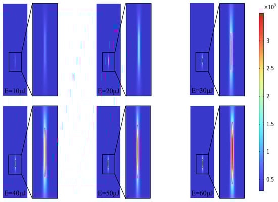 As depicted in Figure 4, at an energy of E = 10 μJ and 20 μJ, it is noteworthy that the internal temperature of the material fails to attain the boiling temperature characteristic of silicon after 10 ps of the thermal diffusion. As the laser pulse energy increases, a rise in energy absorption occurs, resulting in an amplified heat transformation, leading to its diffusion throughout the surrounding region. It can be explained that the increase of energy corresponds to an increase in the electric field E(x, z), as dictated by Equation (3), delineating the relationship between the electric field and laser intensity. It is discernible that the variation in modification depth aligns consistently with the energy.
