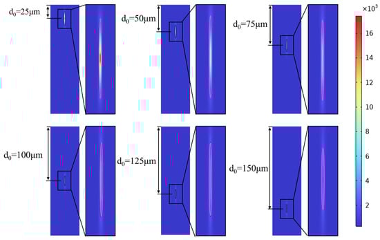 As the laser beam irradiates the material surface, some incident energy penetrates a confined depth, transforming into heat energy. In Figure 3a, the computation of the electric field is conducted by utilizing Maxwell’s and Helmholtz’s equations, treating it as the heat source. Subsequently, in Figure 3b, the temperature field is calculated using a thermal conduction model. The resulting distribution of the electrical-induced temperature field at 10 ps is visually depicted. Notably, the temperature field aligns relatively with the electric field at the energy E = 60 μJ, focusing at d0 = 100 μm. Furthermore, the phenomenon of focal zone elongation, attributed to the refractive index disparity, is easily observed.