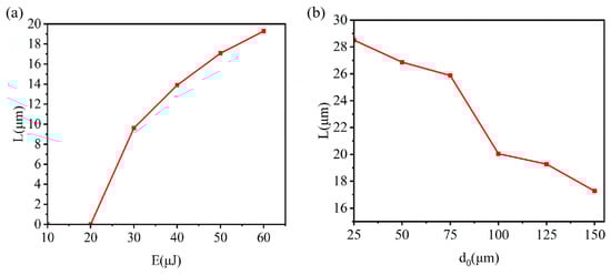 (a) The change curves of modification depth L under the increasing of laser pulse energy E at 10 ps. (b) The change curves of modification depth L under the increasing of focusing depth d0 in the simulated model at 10 ps.