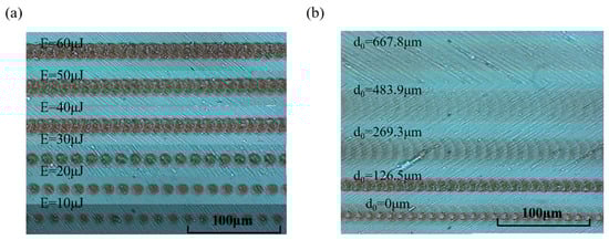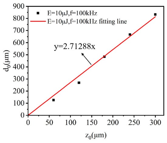 The linear fitting of the objective lens displacement and the focusing depth within 4H-SiC along the z-direction is displayed in Figure 7. The laser pulse energy is E = 10 μJ, and the repetition frequency is f = 100 kHz. In this part, z0 represents the distance of the objective lens movements. The experimental results reveal that the moving distance of the focus zone inside the 4H-SiC is 2.71 times that of the objective lens.