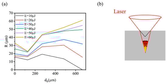 (a) The modification radius changes curve with the variation of laser pulse energy E and focusing depth d0. (b) Schematic model diagram of modification radius inside the material.