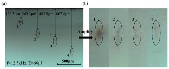 Figure 10 illustrates the depth of modification layer changes at a repetition frequency of f = 12.5 kHz and an energy of E = 60 μJ. In Figure 10b, an enlarged figure of E = 60 μJ is presented. At focusing depths of 126.5 μm and 263.9 μm, where the spherical aberration is not substantial, and the energy loss is limited, the resulting modification zone is more conspicuous and exhibits an elliptical shape. Contrastingly, at focusing depths of 483.9 μm and 667.8 μm, the modification depth expands vertically, forming a conical shape with an extended stretch length.