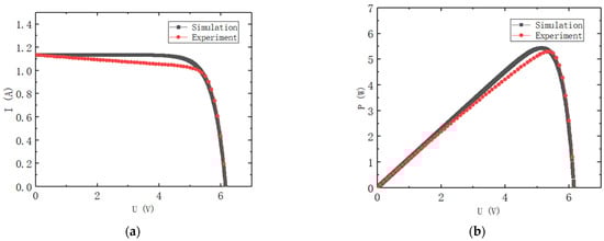 At this time, five parameters, Isc, Uoc, Um, Im, and G, can represent the output characteristics of the LPC, which better fit the output I–V characteristics. To verify the matching degree between the output characteristics of the model and the measured LPC, this paper compares the simulation results and the actual measured results under the condition of 1 W/cm2, as shown in Figure 3a,b. It can be seen from the comparison that the simulation results fit well with the actual test results, which can fully meet the prediction and verification function of the theoretical simulation of the array on the experimental results. The parameters of the LPC are detailed in Table 2.